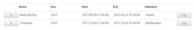 Give this holiday a descriptive name. Spaces are allowed here if you want. Select the year that this schedule should apply to, or select “All Years” to have the schedule repeat each year. Click in the blank field next to Holiday Start to select the month and day, then use the next two fields to define the hour and minute. Do the same for the end date and time. In the “Holiday Attendant” field, select one of your attendants as the designated target that will be used for the duration of the holiday. Click the Save button. If you return to the Holiday Schedule main page, you will see every holiday displayed, along with its start/end times and the attendant that will be activated.